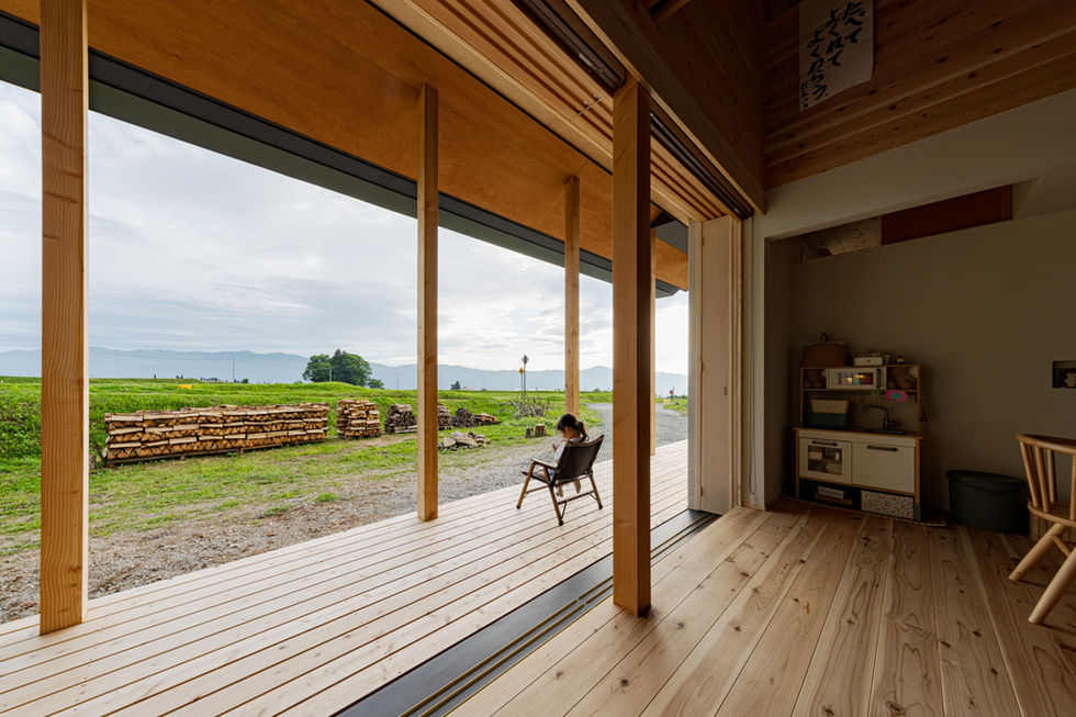 開放的な風景の拡がる南側には大きな縁側を取り、その上に屋根を伸ばして、暮らしが縁側を介して外まで拡がっていくことを意図しました。